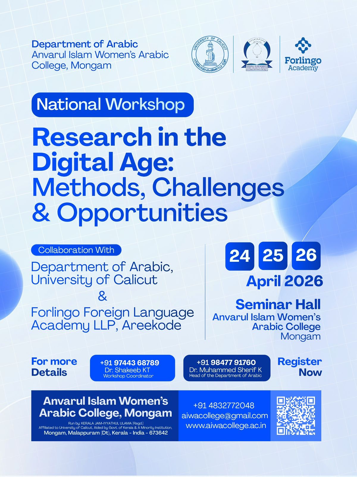 The Department of Arabic, Anvarul Islam Women’s Arabic College, Mongam, invites you to a comprehensive National Workshop on "Research in the Digital Age: Methods, Challenges & Opportunities."
