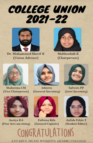 College union is an organization of students’ representatives formed every year as per the guidelines issued by the University of Calicut and Lyngdoh Commission Report. The principal office bearers include: Chairman, Vice Chairman, General Secretary, Joint Secretary, Arts Club Secretary, General Captain, Student Editor, University Union Councillor, various class representatives and the Secretaries to the various Subject Associations. The college union is intended to organize most of the co-curricular activities of the college, under the guidance of the Principal and the staff advisors concerned.